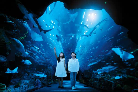 One of the most fascinating parts of the visit is the aquarium tunnel, where you can walk underwater to see manta rays, sharks, and hundreds of fish, and admire how the zoo's divers feed these specimens.