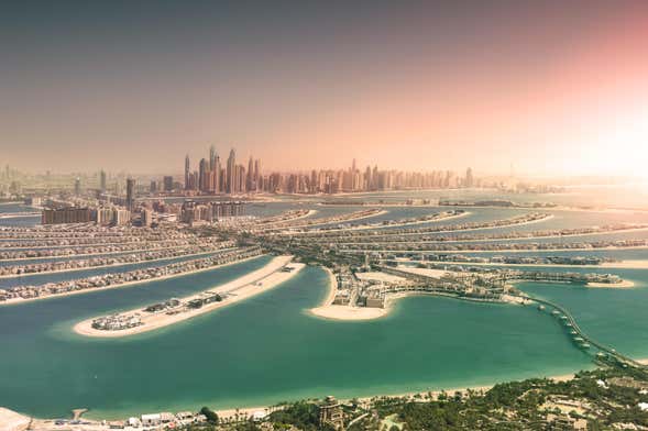 As we approach this incredible monument, we'll also get a glimpse of the famous Palm Jumeirah in the distance. This artificial palm tree-shaped island is home to a wide range of luxury resorts, restaurants and shopping malls.