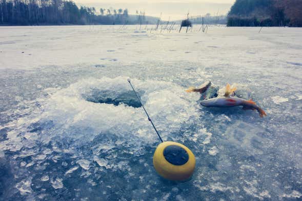 The trail will lead us to a frozen lake where we'll have a short lesson on main ice fishing techniques. We'll learn how to make a hole in the ice and cast the rod. All that's left is to wait for the fish to take the bait!