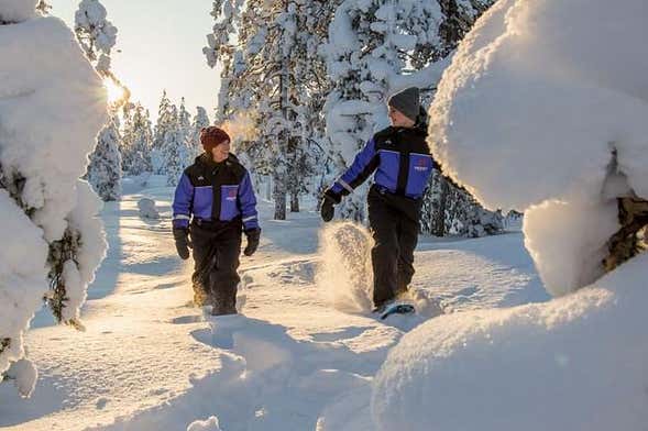 After putting on special thermal clothing that will protect us from the cold, we'll put on our snowshoes and get ready to go. Over the course of about two hours, we'll slide through the snowy paths of the Sirkka forests and take in the beauty of the Finnish countryside.