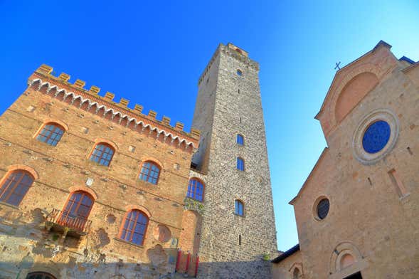 Seguiremos la visita guiada contemplando los exteriores del Palacio Comunal, que guarda un vínculo muy especial con el célebre poeta florentino Dante Alighieri. Os desvelaremos los detalles mientras admiramos la fachada de colegiata de la Asunción de María, flanqueada por la torre Grossa. ¿Sabíais que es la más alta de San Gimignano?