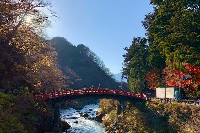 Por supuesto, no podía faltar una parada en el puente Shinkyo, un llamativo puente rojo de estilo japonés que cruza el río Daiya. Su silueta destaca entre el frondoso paisaje verde, y es una de las postales más típicas de Nikko.