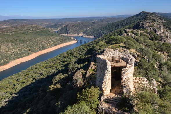 Vous vous promènerez ensuite autour du château de Monfragüe, en suivant les vestiges de ses murs mauresques. Vous découvrirez l'histoire de cette forteresse, qui a été utilisée par différents ordres militaires au cours des siècles comme point défensif en raison de son emplacement stratégique sur une colline.