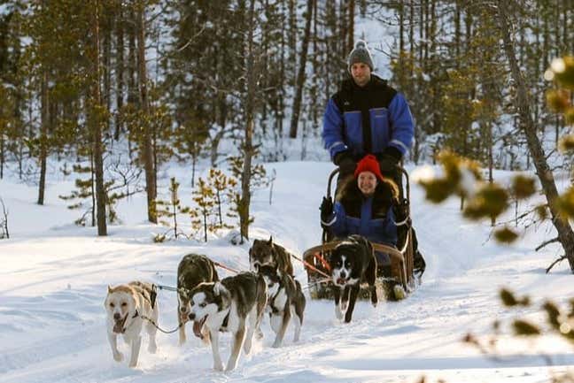 Balade de 5 km en traîneau tiré par des chiens husky.