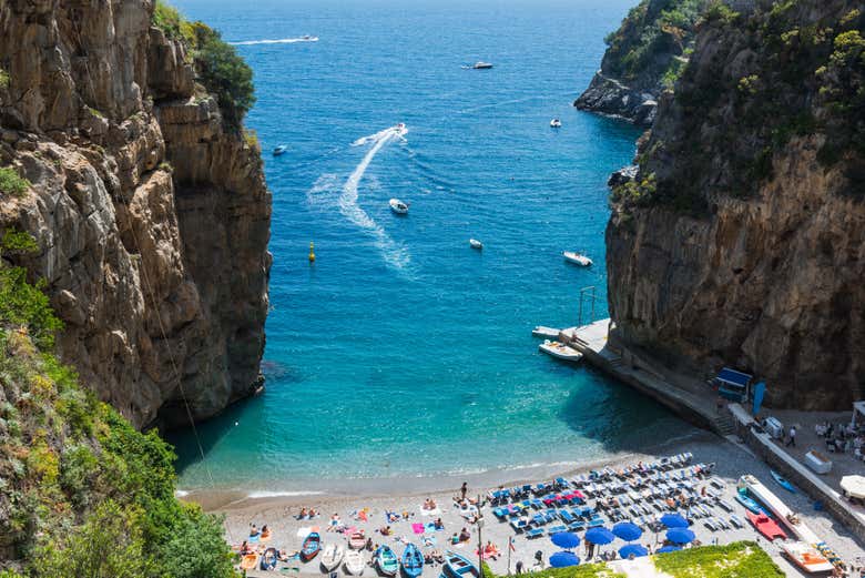La prima tappa del nostro viaggio sarà la località di Praiano, dove vedremo la piccola spiaggia della Gavitella. Successivamente, raggiungeremo Marina di Praia, una tranquilla baia abbracciata da due imponenti speroni di roccia a strampiombo sul mare.