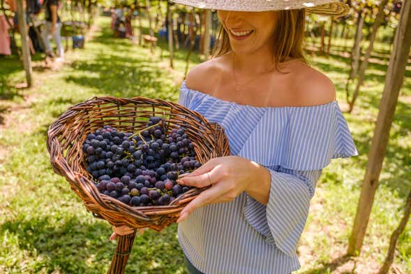 Depois do passeio na Maria Fumaça, será a hora de participar da vindima em uma propriedade rural familiar onde conheceremos o universo da viticultura. Lá, vamos conhecer os métodos dos imigrantes italianos para a produção do vinho: a pisa das uvas. Vai lhe surpreender! Também veremos as parreiras, ou videiras, enquanto aprendemos mais sobre a cultura do vinho nas Serras Gaúchas. Tudo isso acompanhado, é claro, de músicas e comidas típicas, o famoso merendim.