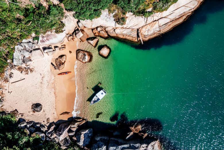 A próxima parada é a praia do Cação, também conhecida como praia do Trampolim. Lá, você poderá pular do trampolim do barco ou deslizar pelo tobogã para dar um mergulho refrescante.