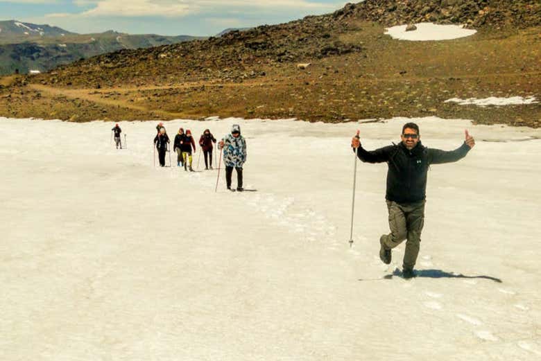 Continuaremos pela trilha que serpenteia entre arbustos dispersos do prado semidesértico tão característico da região. Veremos alguns riachos resultantes do degelo e, em alguns trechos, se tivermos sorte, cruzaremos áreas com neve.