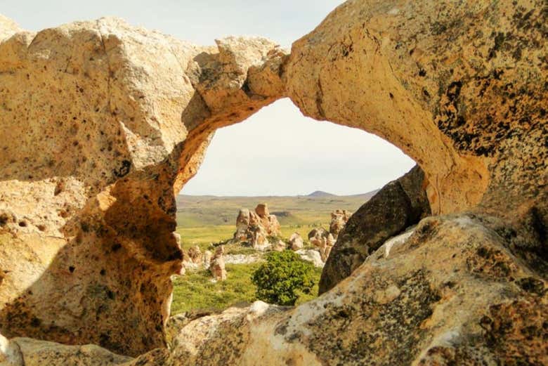 Depois de uma agradável viagem de 30 minutos, chegaremos à entrada da fazenda privada de Riscos Bayos. Lá, pegaremos os bastões de trilha e iniciaremos a rota por formações rochosas esculpidas pela própria natureza. Essas formações chamados ignimbritos foram forjados ao longo de milhões de anos por erupções vulcânicas. Você passará por várias colunas, curiosos pilares e pináculos.