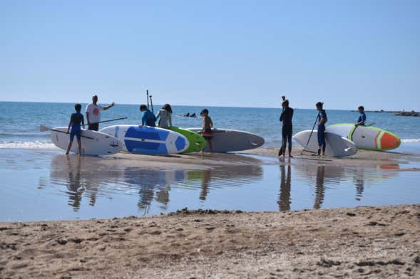 Na areia, receberemos uma explicação teórica que nos permitirá aproveitar ao máximo as duas horas de aula de paddle surf. Desta forma, aprenderemos as regras principais para navegar, o giro básico e a mudança de mão.