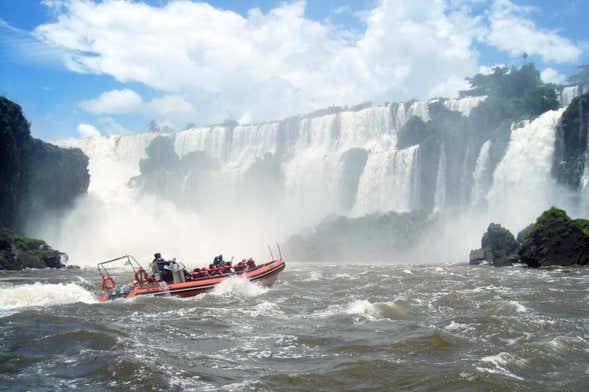 A bordo da embarcação contemplaremos as Cataratas do Iguaçu da água e, em seguida, navegaremos até o salto Tres Mosqueteros. Deste ponto teremos uma vista panorâmica privilegiada das cataratas da Argentina e do Brasil. Chegaremos ao incomparável salto San Martín, o segundo maior do parque, com uma queda espetacular de 80 metros. Você vai chegar tão perto que vai acabar encharcado!