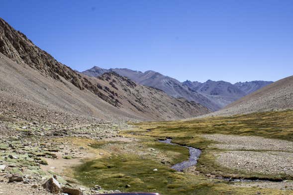 Quando já tivermos tudo preparado, iremos almoçar e iniciaremos uma emocionante trilha pela Quebrada Amarilla. Durante essa caminhada, em que percorreremos entre 3 e 4 quilômetros, atravessaremos uma bela zona de vales antigos, onde veremos a majestosidade da cordilheira Altoandina do Chile.
