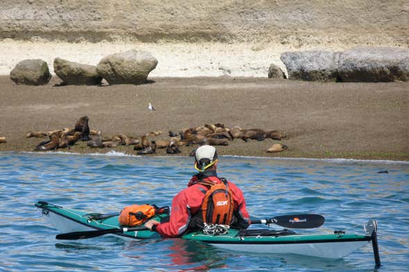 Quando estivermos preparados, caminharemos rumo à praia e começaremos a remar pelas águas do golfo Nuevo. Desfrutaremos das incríveis vistas da costa enquanto nos aproximamos de uma colônia de lobos-marinhos. Quando você menos esperar, eles aparecerão na metade do mar. Será incrível!