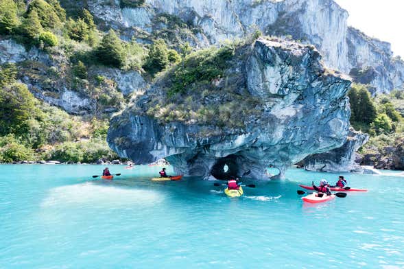 No horário indicado, nos encontraremos no cais de Puerto Tranquilo e começaremos um tour de caiaque pelas cavernas de mármore do lago General Carrera.