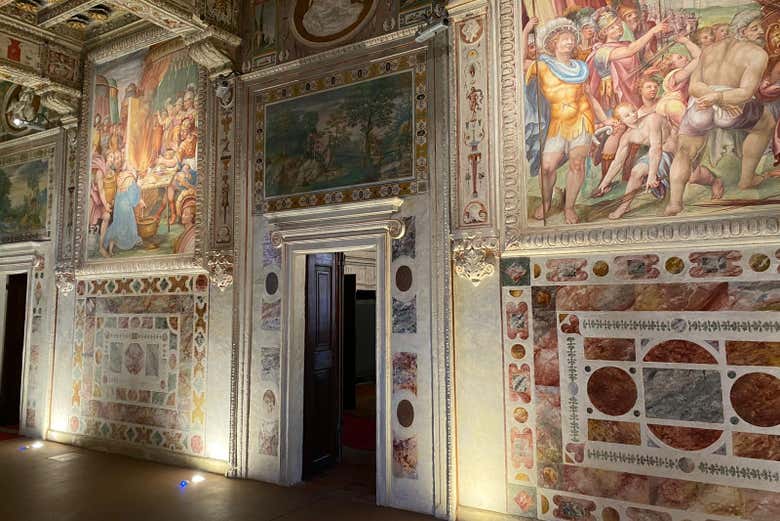 Entre os diferentes espaços que exploraremos estão a Sala dos Escudos, enriquecida com uma grande coleção heráldica, e a Loggia dos Grotescos, onde veremos uma série de afrescos criados por Pietro Dolce. Observaremos criaturas imaginárias e monstruosas que lembram os personagens das pinturas típicas de El Bosco.