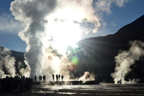 El Tatio é um dos lugares mais visitados do deserto de Atacama. Nessa zona, admiraremos de perto as constantes erupções de vapor de pequenas crateras que formam o terceiro maior campo de gêiseres do mundo. Em seguida, desfrutaremos de um delicioso café da manhã enquanto contemplamos a atividade geotermal ao amanhecer. Você ficará encantado!